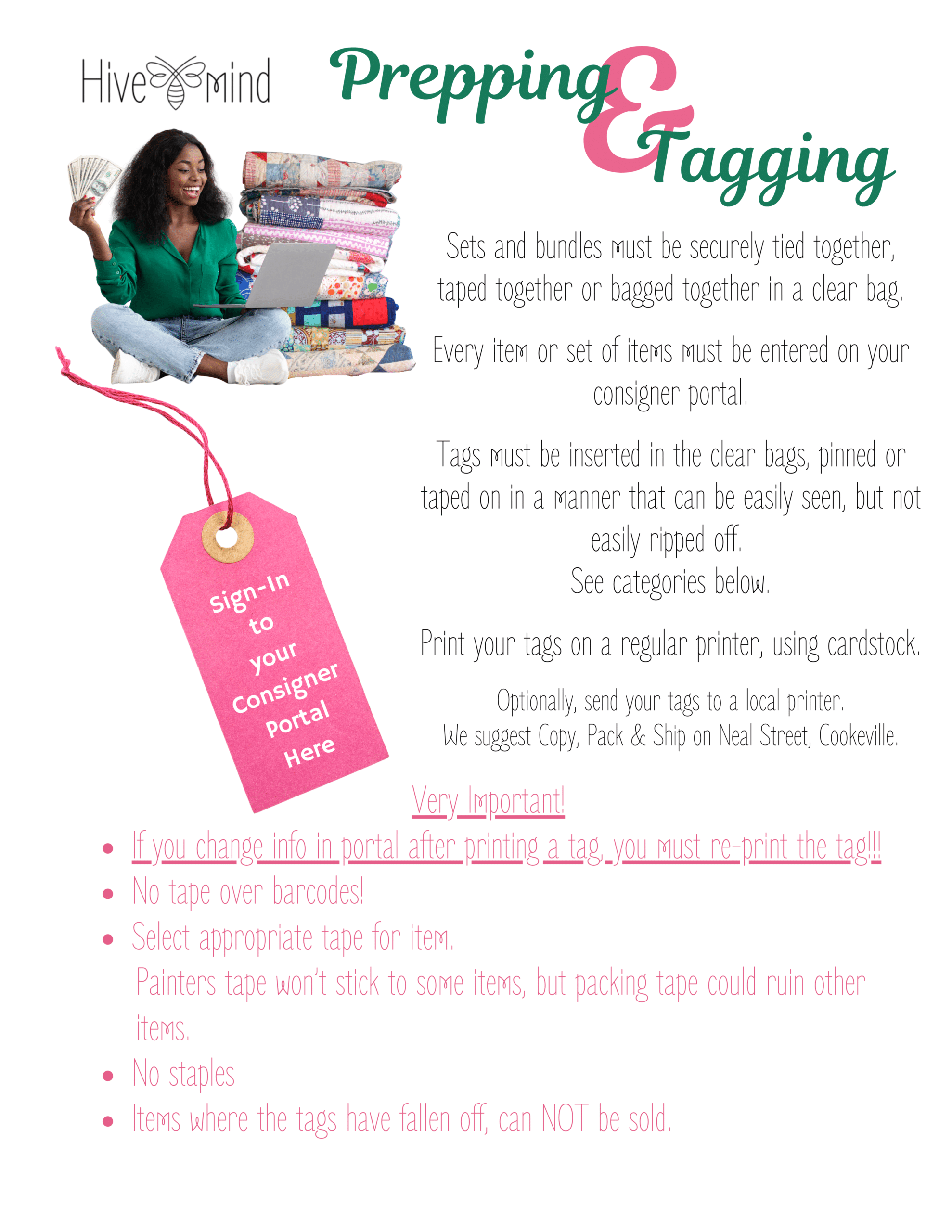 Tags must be able to be taped or tied to the item or item must be bagged with a tag taped on front.